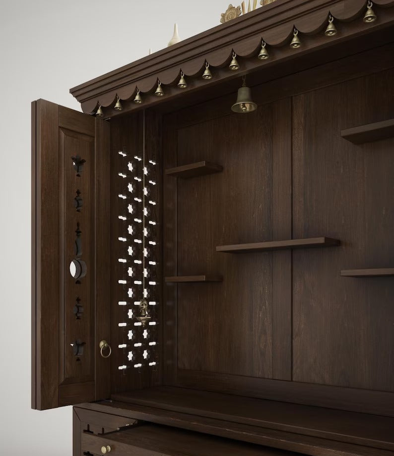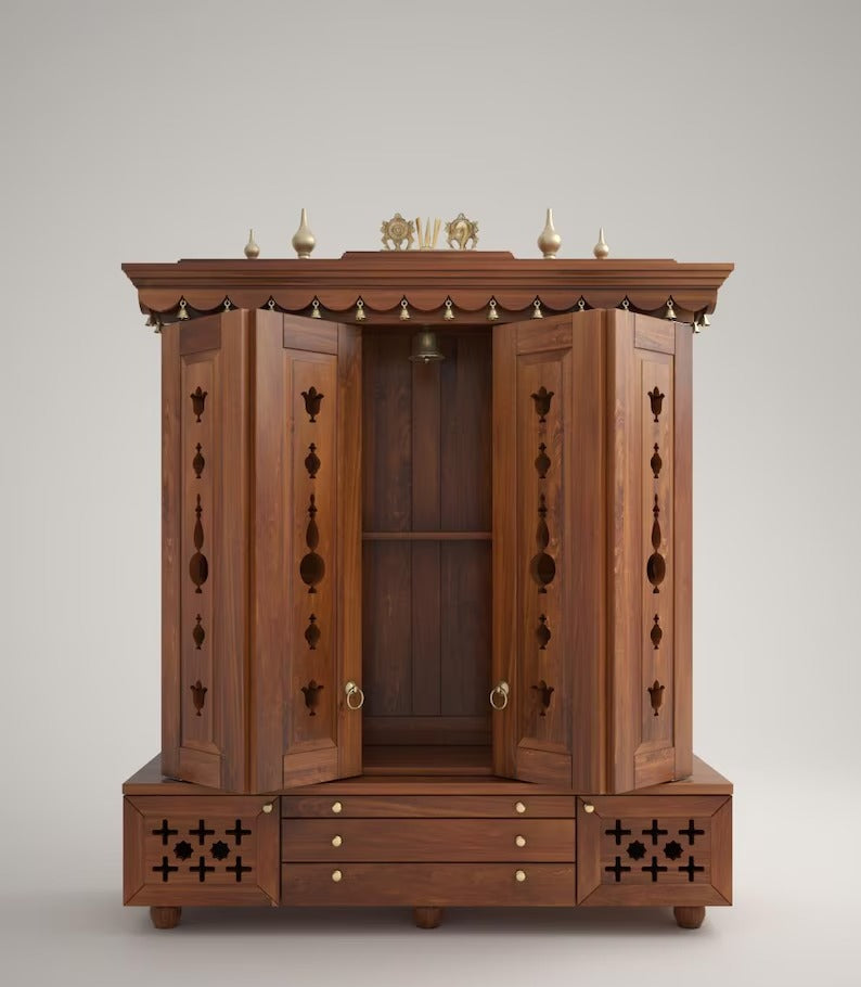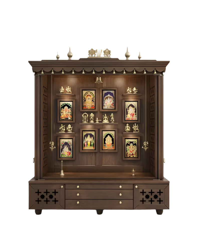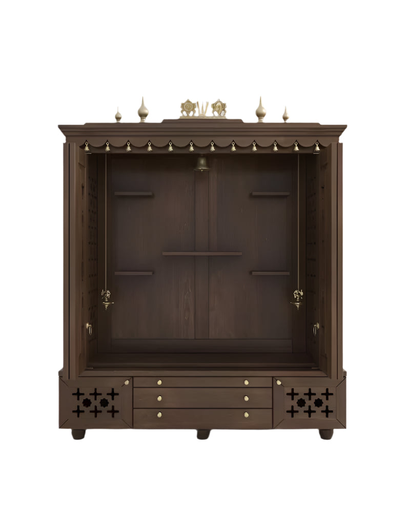This wide-based free standing solid wood temple is a perfect addition to any home. This magnificent temple with its intricate lattice sides and shutters with lotus motifs is truly divine.